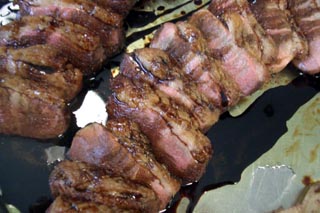 | 黒く見えるのは、バスサミコ酢を一瓶(200ml)丸ごと 煮詰めて作られたとっても贅沢なソース。 お肉を取り分けたあとは、フランスパンにつけて。 |