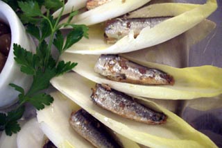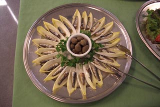 | お皿代わりのチコン(チコリ)と共に。 イタリアンパセリがオリーブの実の器の周りを彩り見た目もキレイ。 国産の背黒いわしをエキストラバージンオリーブオイル、月桂樹の葉、塩につけこんだという このオイルサーディンは、肉厚でふっくらとした食感、ほどよい塩加減で美味でした。 この身の厚みじゃ1缶に3尾しか入らないのでは? という声もあったほどです。(実際は12尾入っているそうです) |