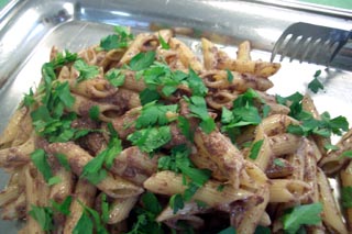 黒オリーブの実の塩水漬ペースト、オリーブオイル、塩、 コショウで味付けされたシンプルなパスタ。 イタリアンパセリと共に。 |